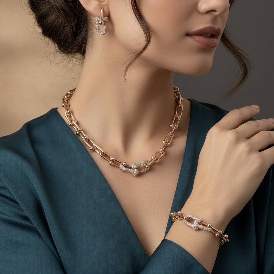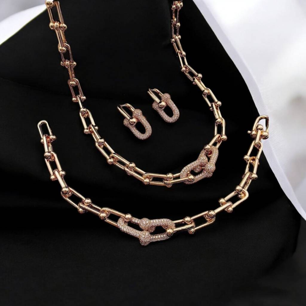 ست از برند دریم شامل گردنبند و گوشواره و دستبند ضد حساسیت روکش طلا رنگ ثابت از برند دریم آبکاری فوق العاده