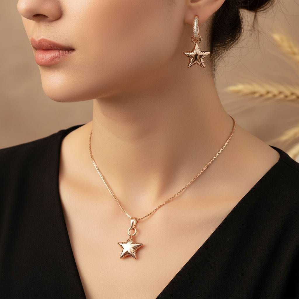 نیم ست شامل گردنبند ( پلاک و زنجیر) و گوشواره ضد حساسیت روکش طلا رنگ ثابت از برند ژوپینگ فوق العاده ظریف و شیک